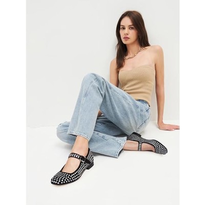 DOEYG Rhinestone Mary Jane Flats for Women Sparkly Ballet Flats with Buckle Strap Square
